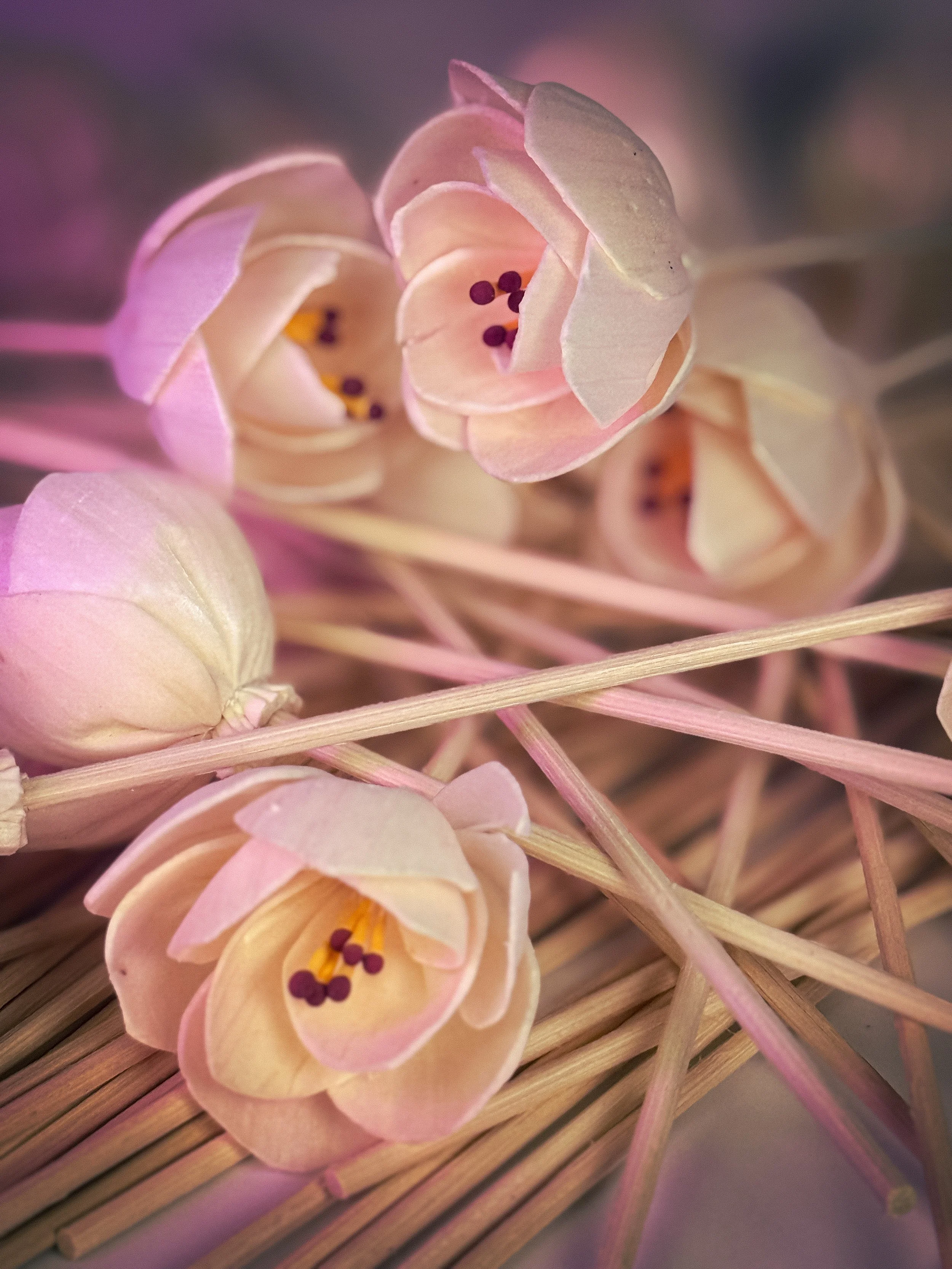 Each reed diffuser comes with four standard reeds and two decorative flower reeds. Cube Reed diffusers last up to six months. Large Square Reed Diffusers last up to one year.